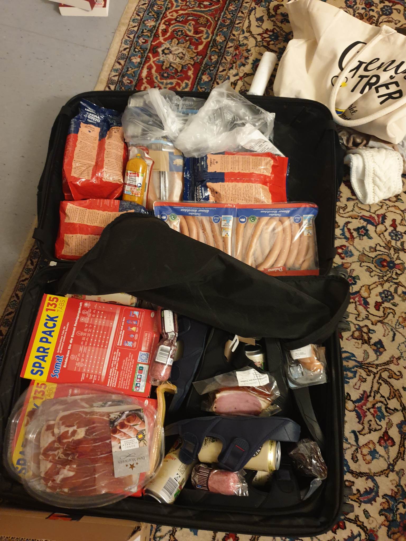 Auf die andere Seite wird mit Schinken, Wienerle, Fleischwurst, Kaffee, Tabs, Leberwurst und Matjes Tetris gespielt, bis nix mehr wackelt. Die Lücken werden mit Weißbierdosen und Kulturbeutel gefüllt. Es sitzt alles perfekt. Ich schließe den Koffer, brauche nicht einmal die Vergrößerung und wiege ihn. Wir haben immer eine Kofferwaage im Gepäck. 27 KG zeigt diese. Aha, 7 zu viel. Ich frage Andreas, was ich machen soll. 5 kg Übergepäck dazubuchen kostet 49 Euro. Oder doch Tabs und Kaffee ins Handgepäck, dafür Klamotten in den Koffer? Ja, alle meine Kleidung passt wunderbar in den Handkoffer. Er meint, ich soll das machen, wären sonst teure Spültabs. OK. Den perfekt gepackten Koffer öffnen, Tabs und Kaffee raus, das sind 3,5 kg. Pulli und Hose in das entstandene Loch. Tabs haben nicht im Handgepäck Platz. Pardon, die Tabs schon, aber nicht in dieser Kiste, die zur Hälfte eh mit Luft gefüllt ist. Also Kiste öffnen, Spülreiniger in den Handkoffer schütten, Kaffee daneben und Reißverschluss zu machen, damit nix mehr aus dieser Hälfte des Koffers fallen kann. Ich wiege den großen Koffer und – 27 KG. Irgendwie habe ich jetzt nur Bäumchen wechsle dich gemacht und dafür schlechter gepackt.